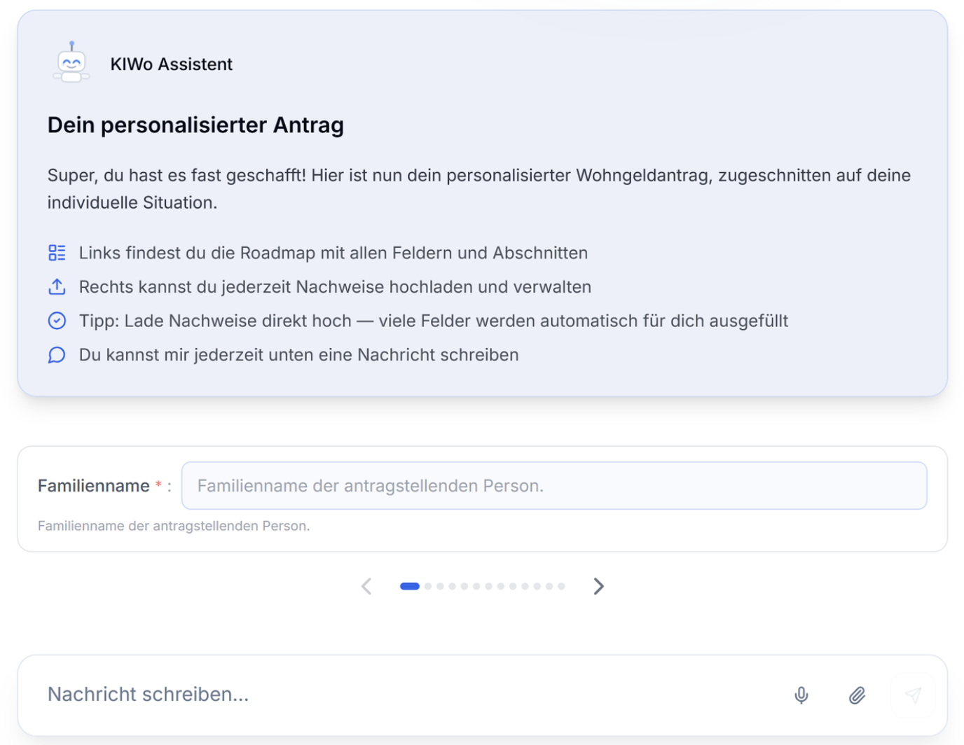 Bürger:innen werden in natürlicher Sprache durch das Formular geführt. AdvoChat erklärt Fachbegriffe, beantwortet Rückfragen und hilft beim Ausfüllen – Schritt für Schritt, ohne Verwaltungsjargon.
