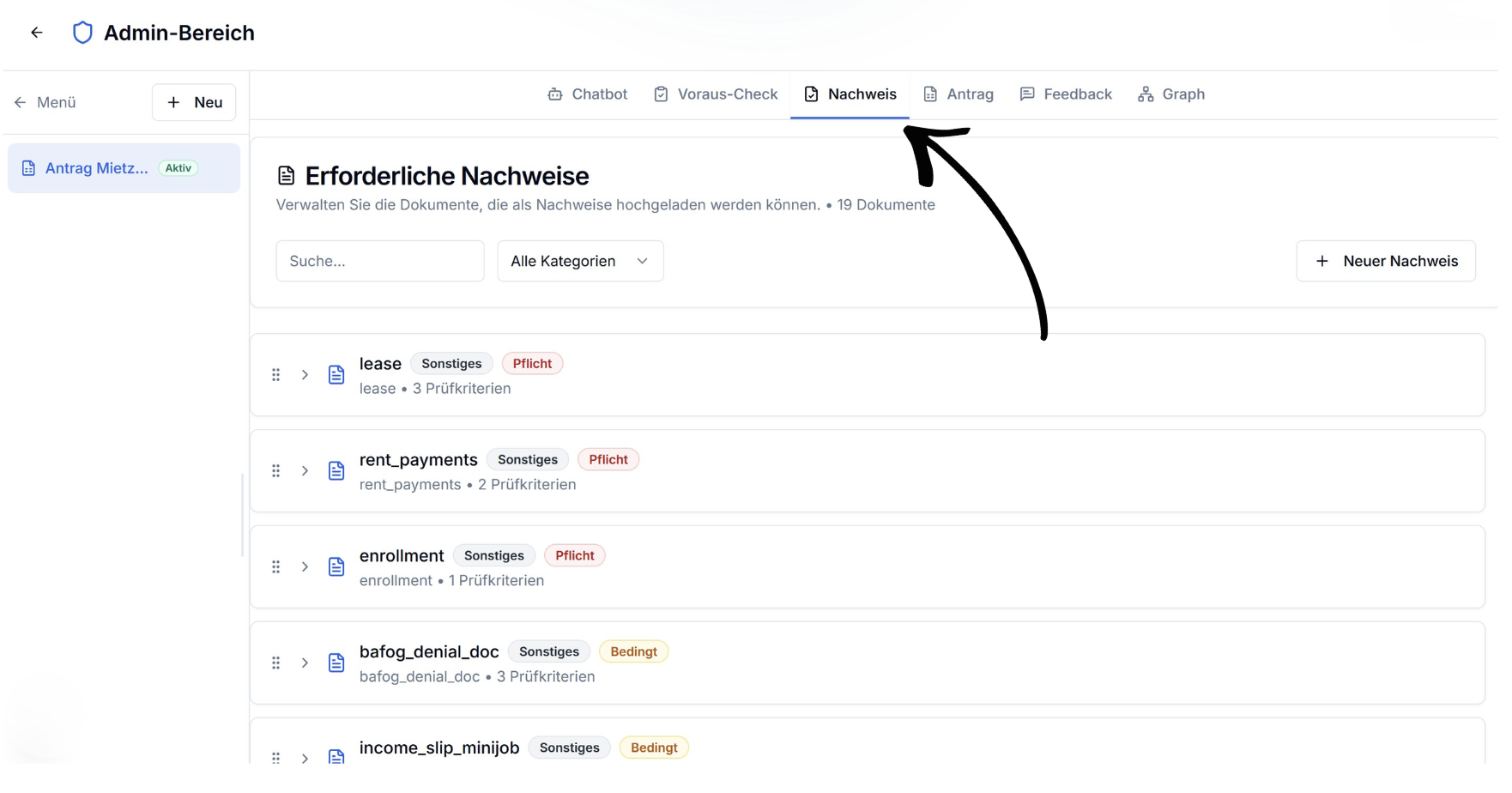 - Nachweispflichten pro Antragstyp festlegbar