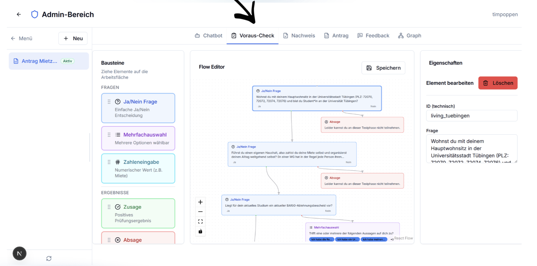 Passen Sie einzelne Antragsfelder granular an: Pflicht- oder Optionalstatus, Validierungsregeln, Hilfetexte und Abhängigkeiten. Die Konfiguration spiegelt sich in Echtzeit im Chatbot und der Formularansicht wider.
